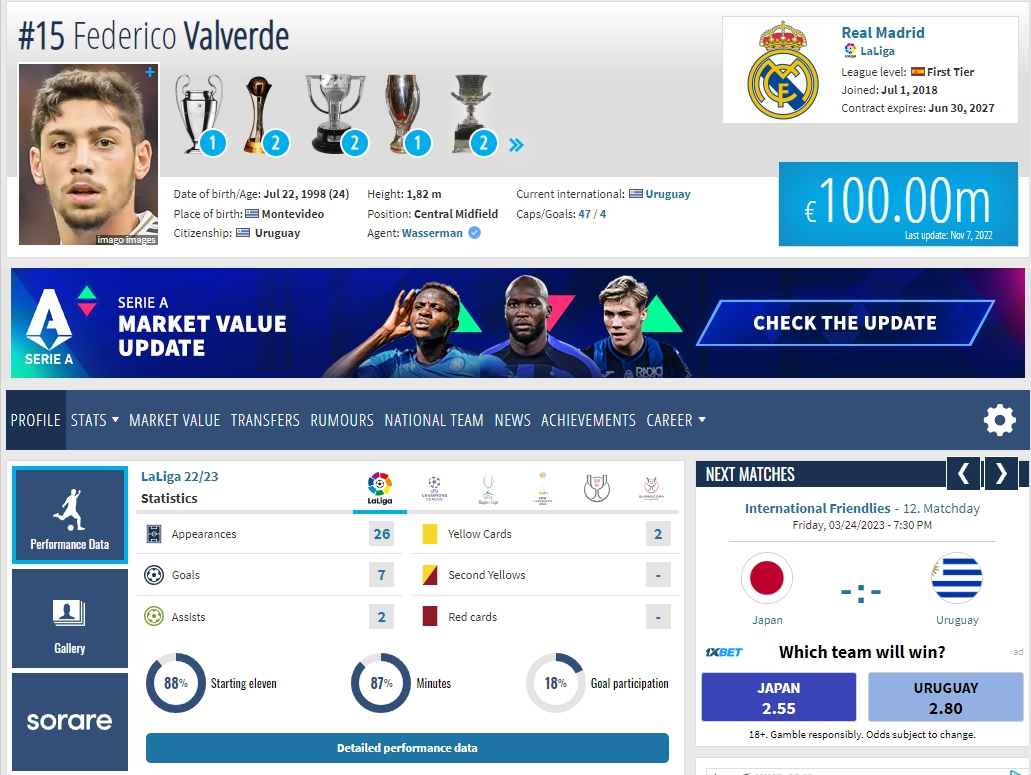 <페데리코 발베르데 몸값 및 연봉, 출처 : 트랜스퍼마르크트>