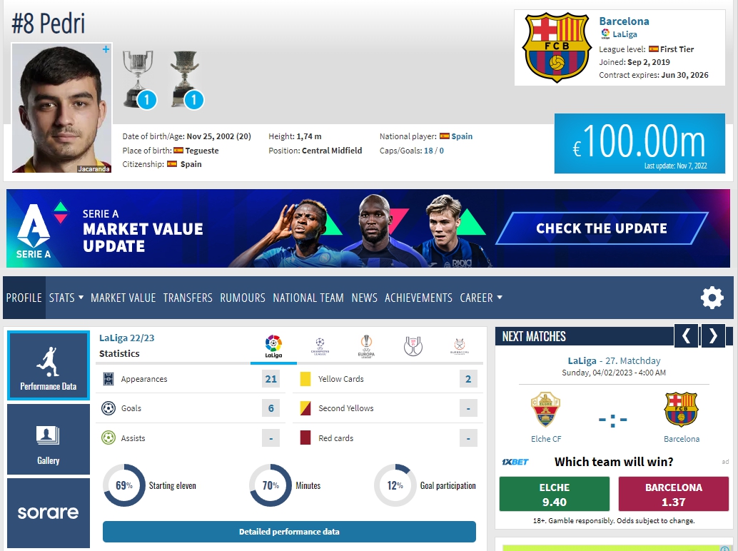 <페드리 몸값 및 연봉, 출처 : 트랜스퍼마르크트>