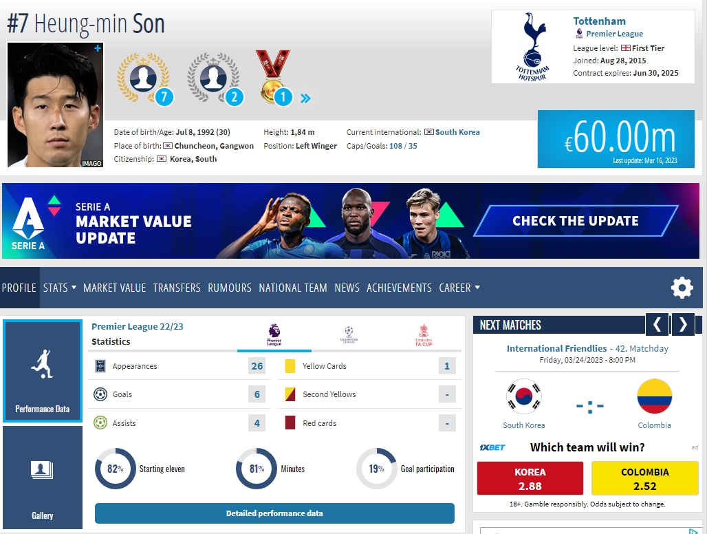 etc. 공동 53위 손흥민 6000만유로(약 845억원, 대한민국)